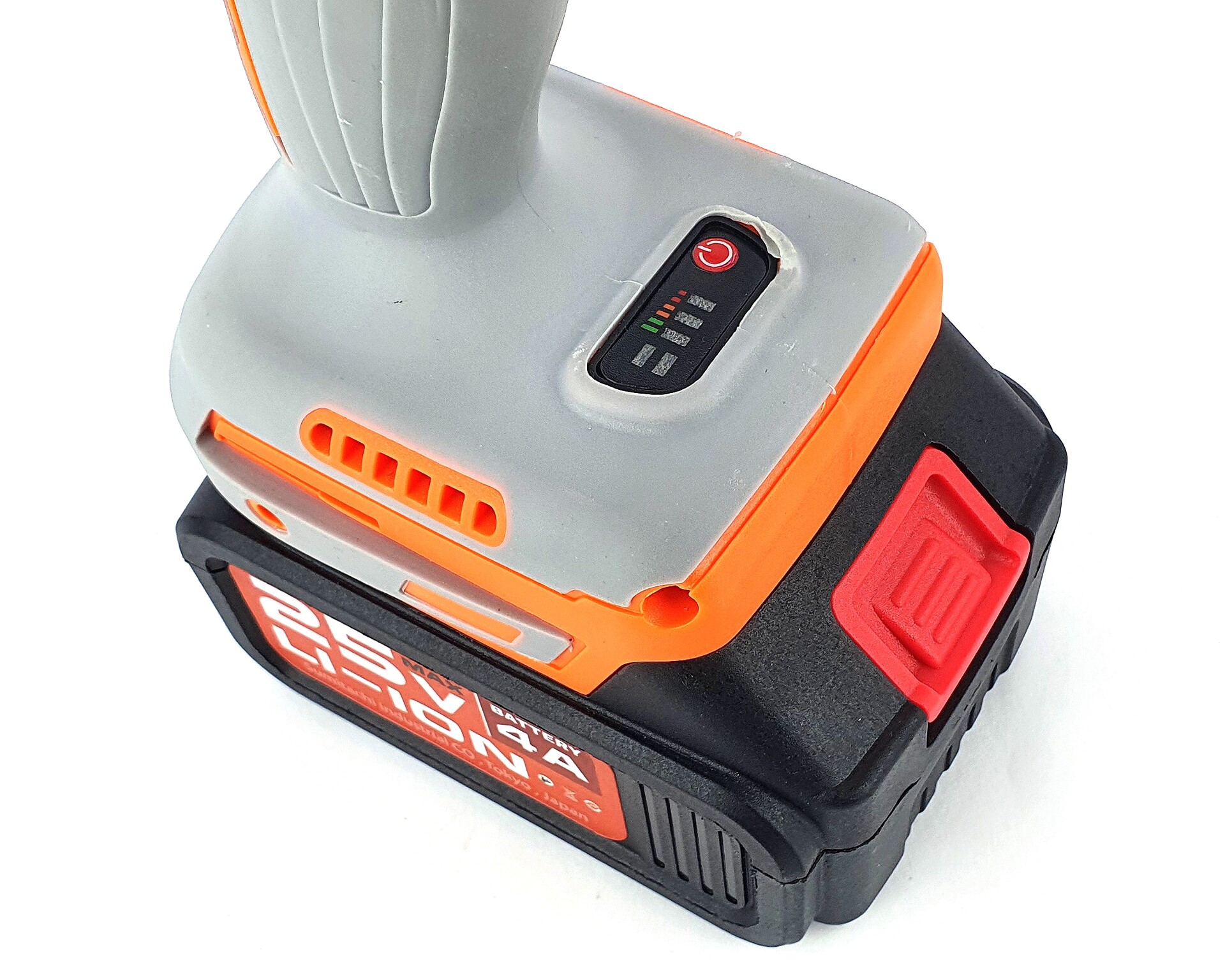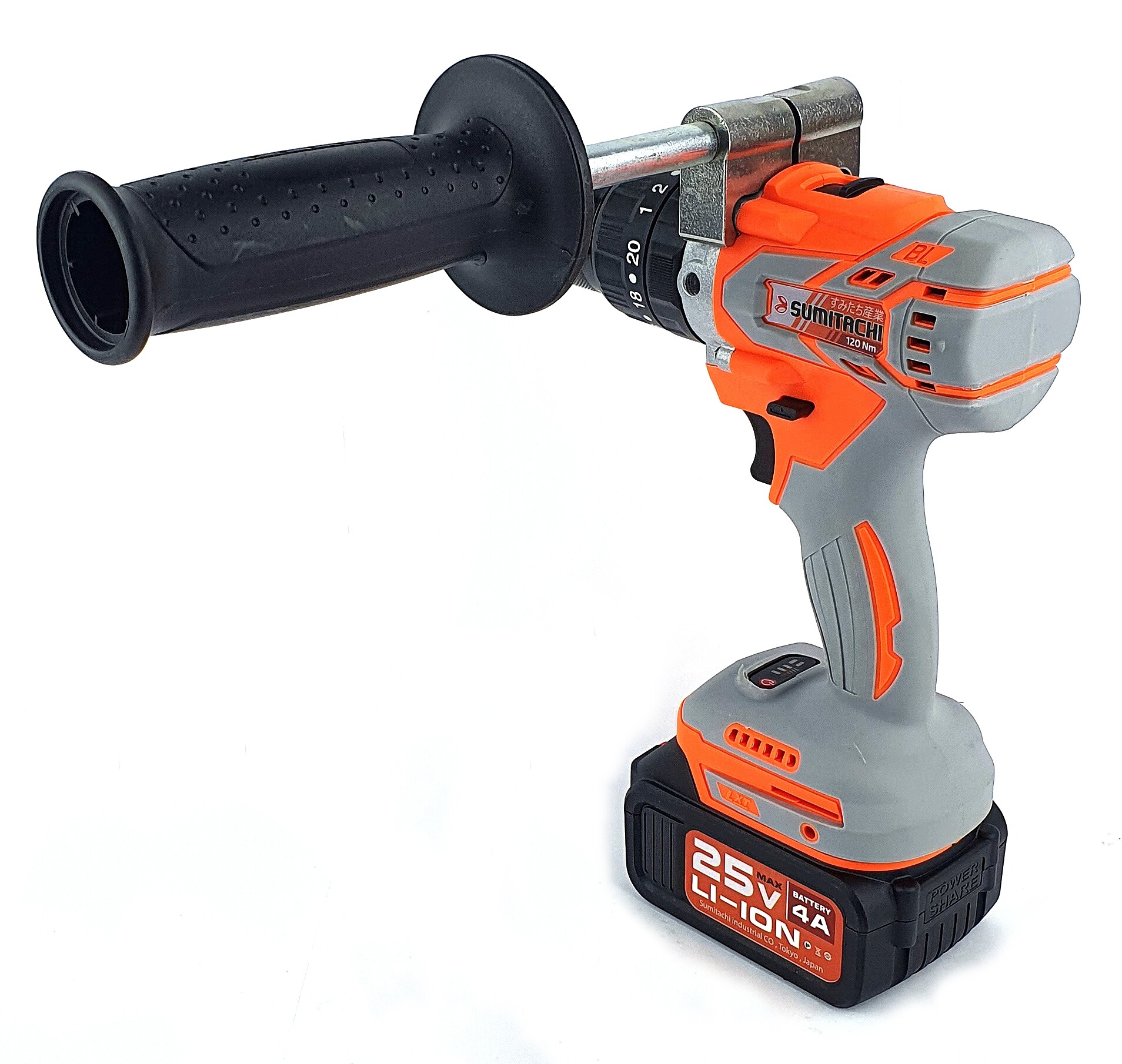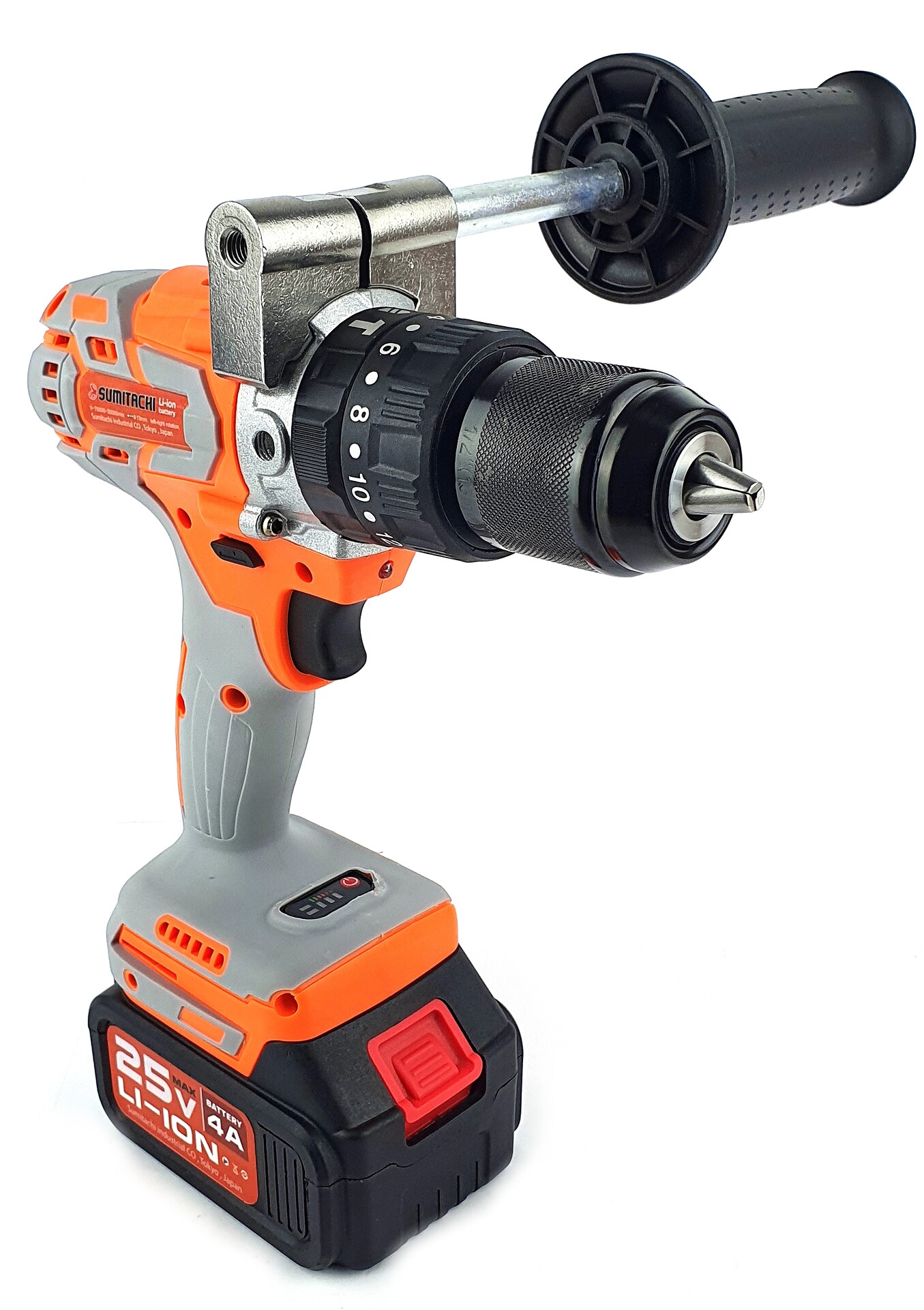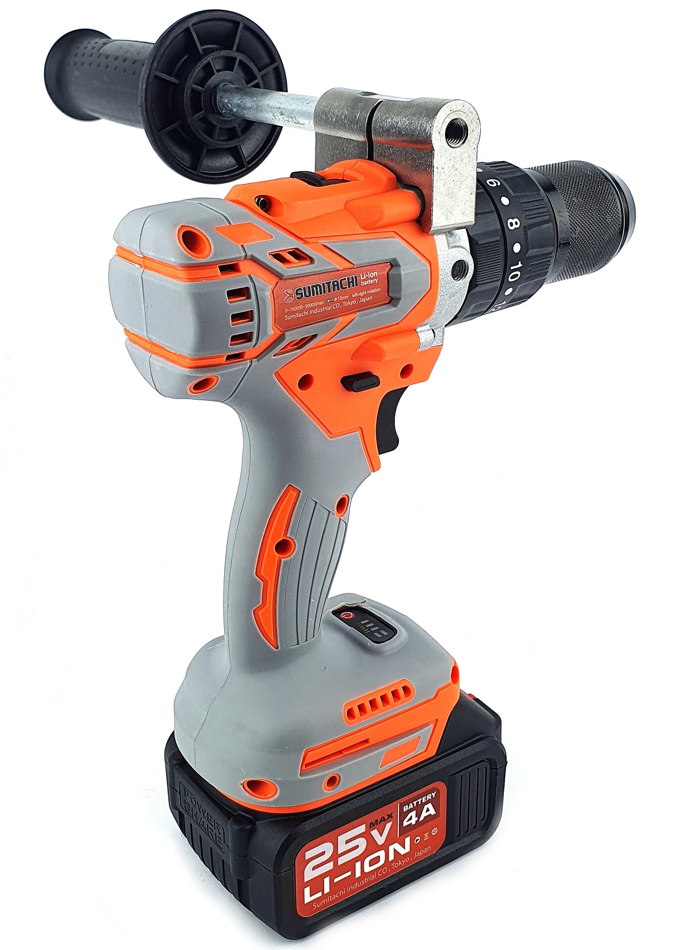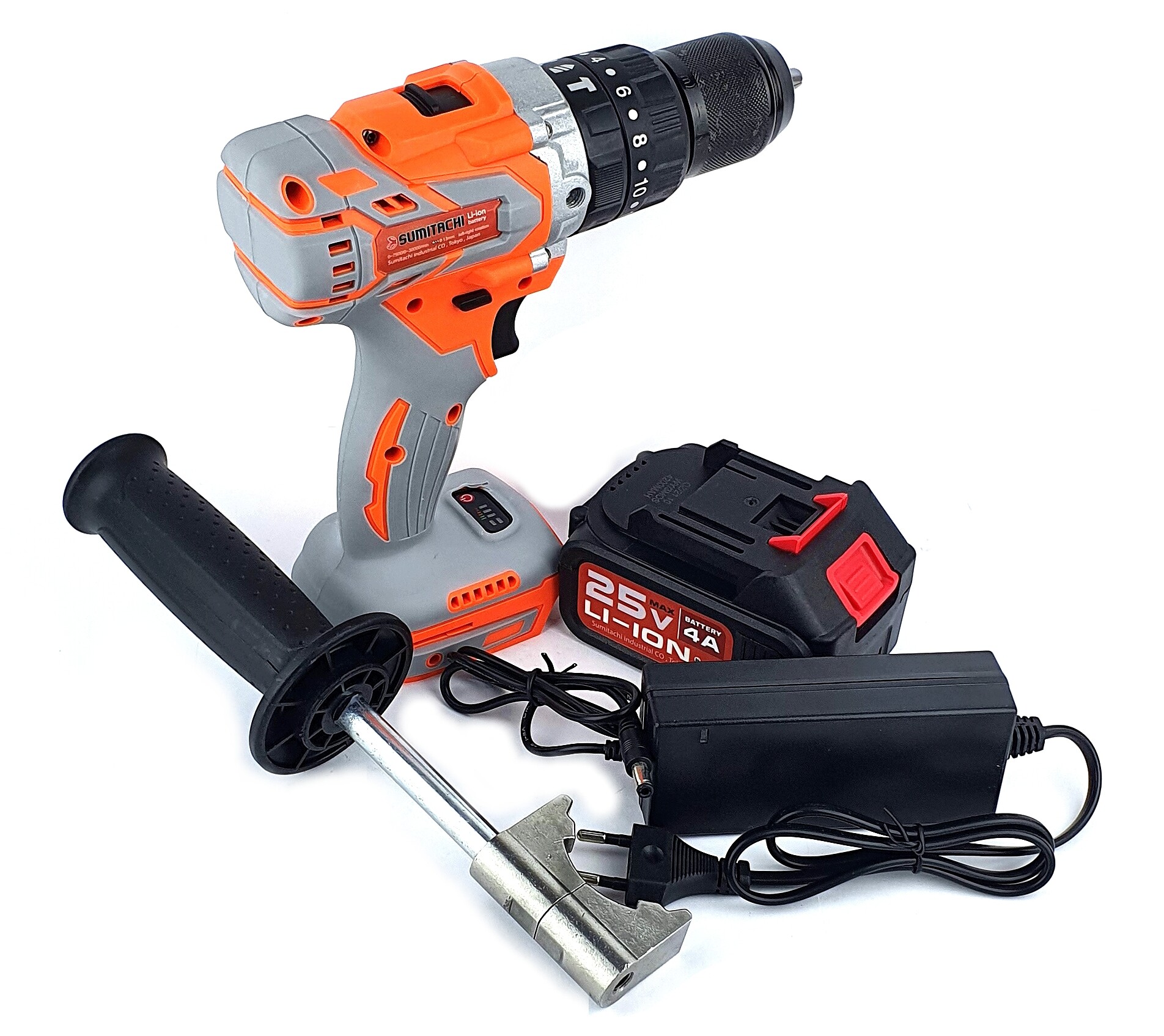 Дрель-шуруповёрт, 1 аккумулятор 4Ah, зарядное устройство, боковая дополнительная ручка.
