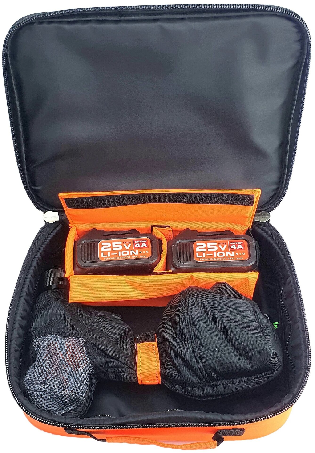 Сумка для электробура Sumitachi предназначена для транспортировки и хранения шуруповерта и двух запасных аккумуляторов.